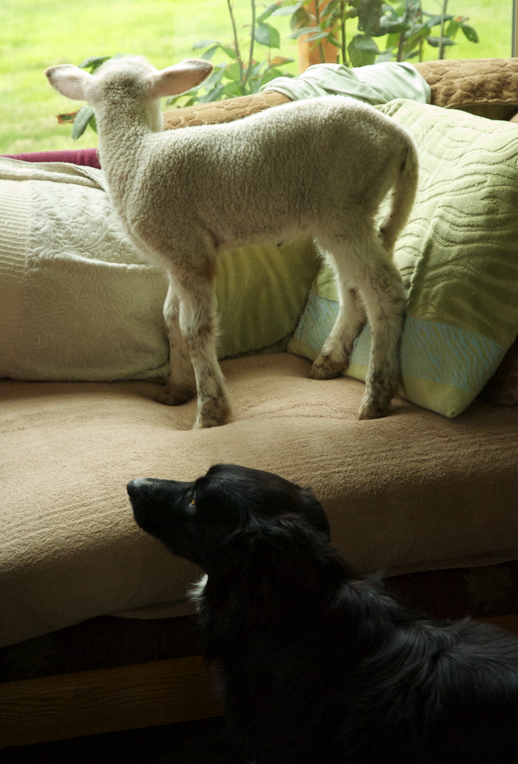 The lamb's inside of course. Precious looking outside at the border collies just takes the cake. We do force her to spend time out in the front half acre with the big boy lambs part of the day. But I'm sure she thinks she's a dog.